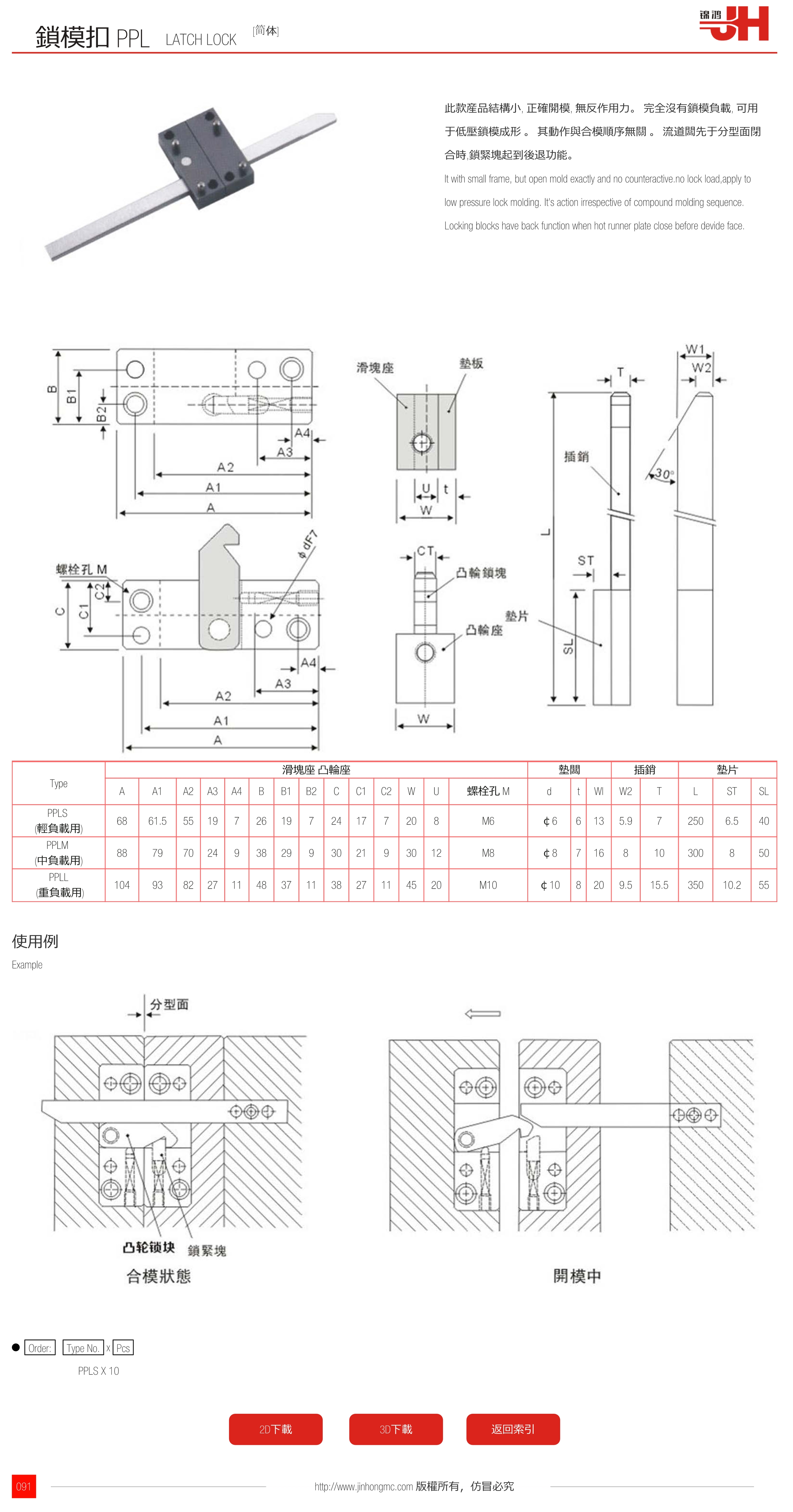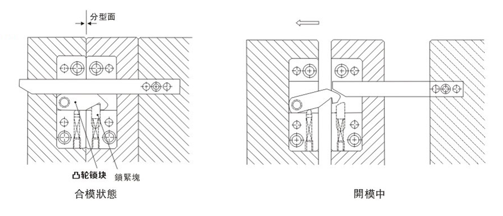 此款産品結構小, 正確開模, 無反作用力。 完全沒有鎖模負載, 可用于低壓鎖模成形 。 其動作與合模順序無關 。 流道板先于分型面閉合時,鎖緊塊起到後退功能。