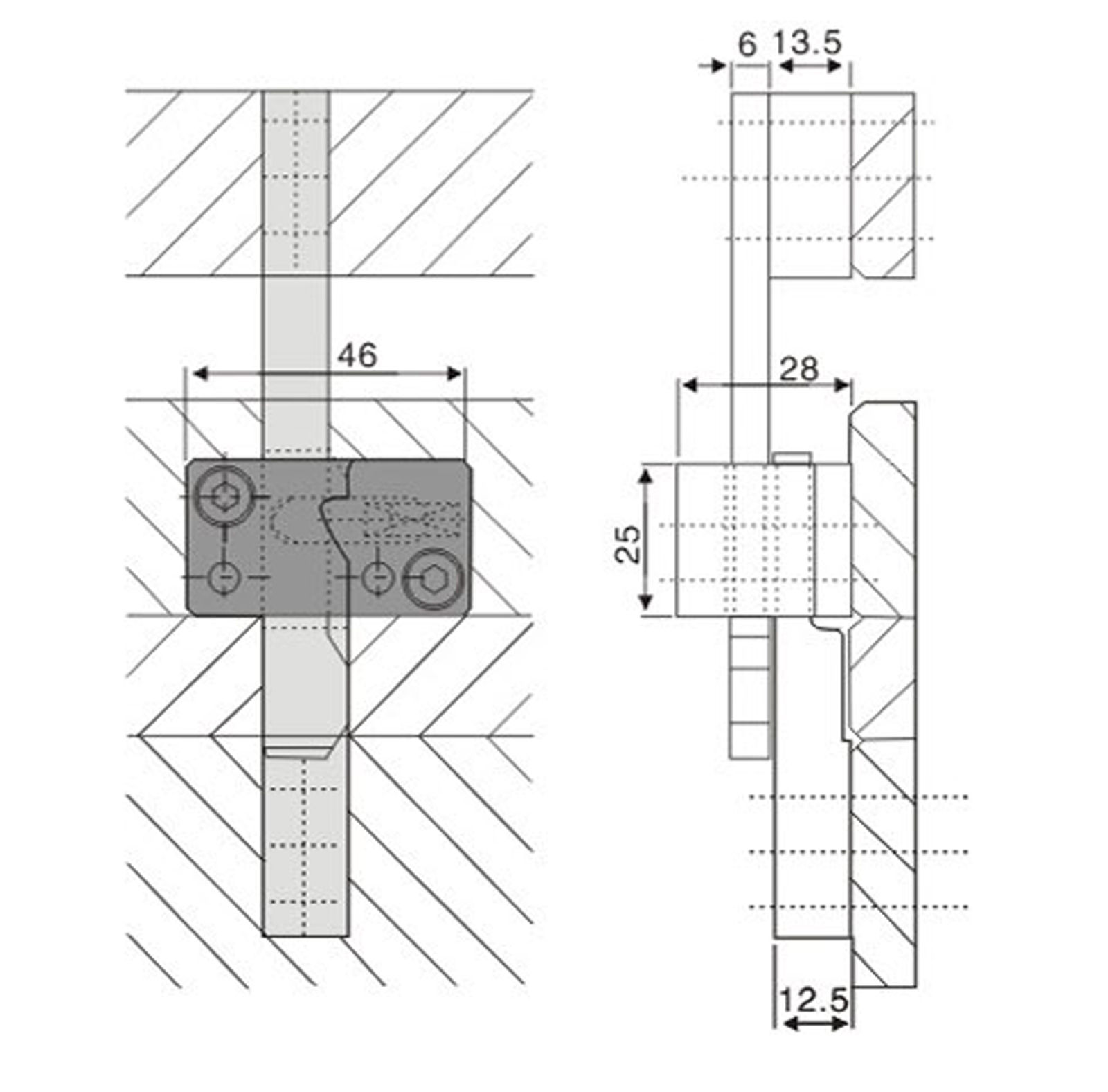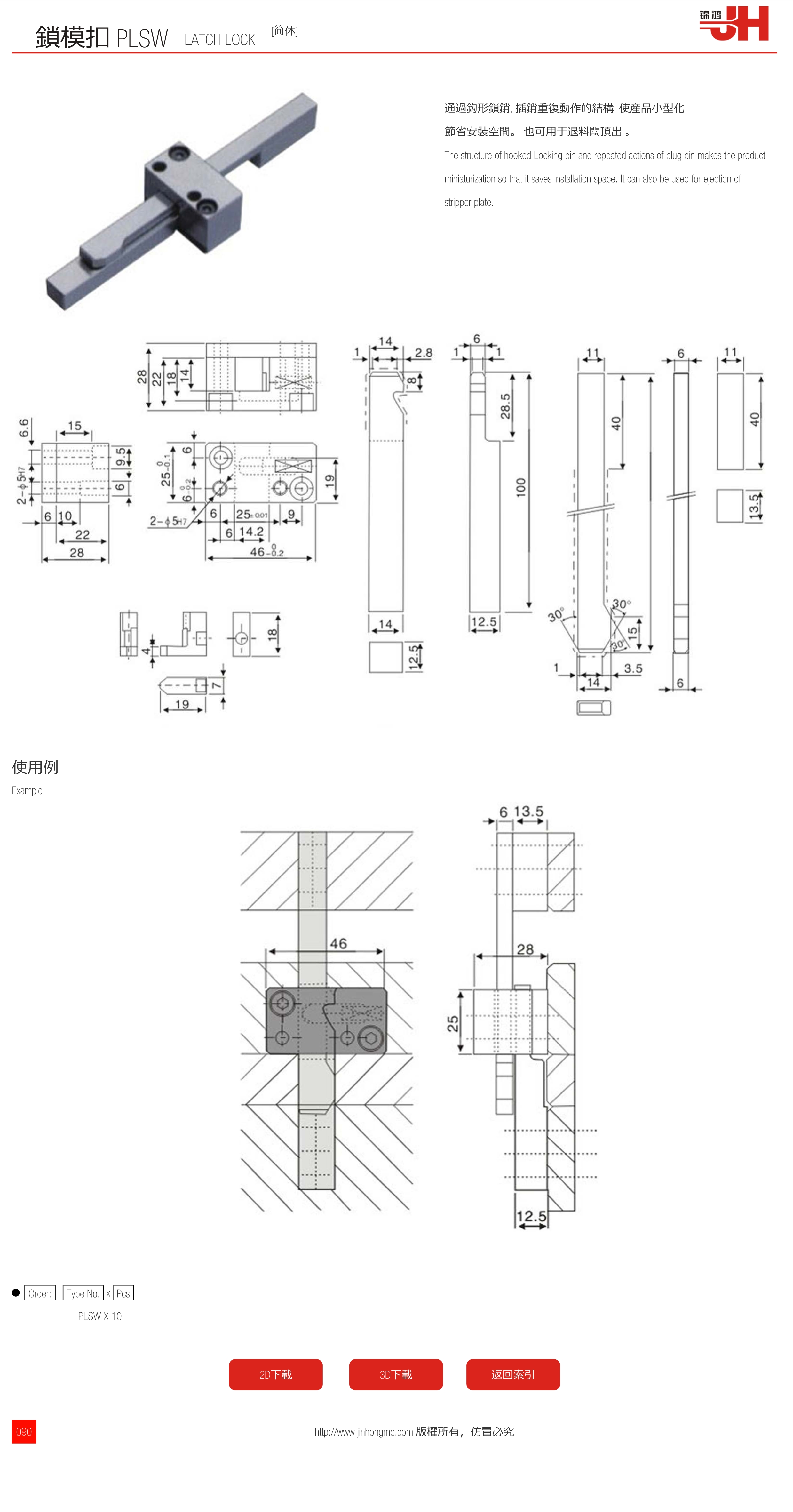 The structure of hooked Locking pin and repeated actions of plug pin makes the product miniaturization so that it saves installation space. It can also be used for ejection of stripper plate.
