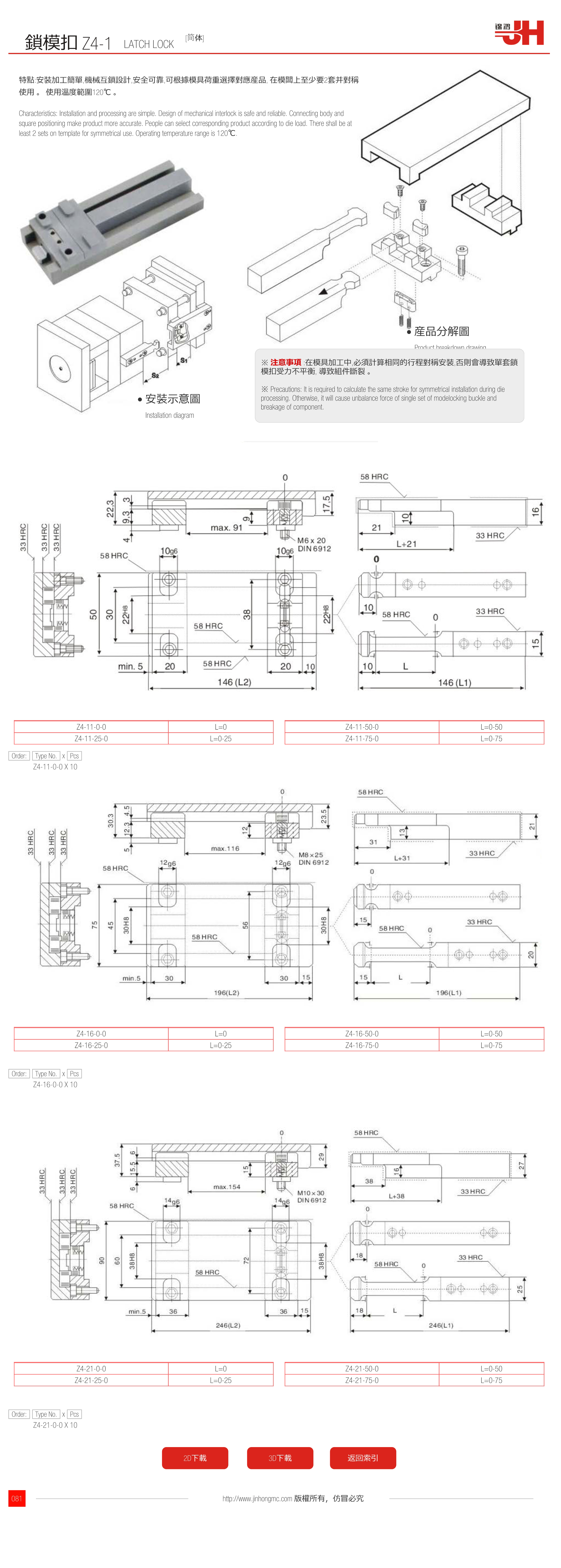※ 注意事項 :在模具加工中,必須計算相同的行程對稱安裝,否則會導致單套鎖??凼芰Σ黄胶? 導致組件斷裂 。