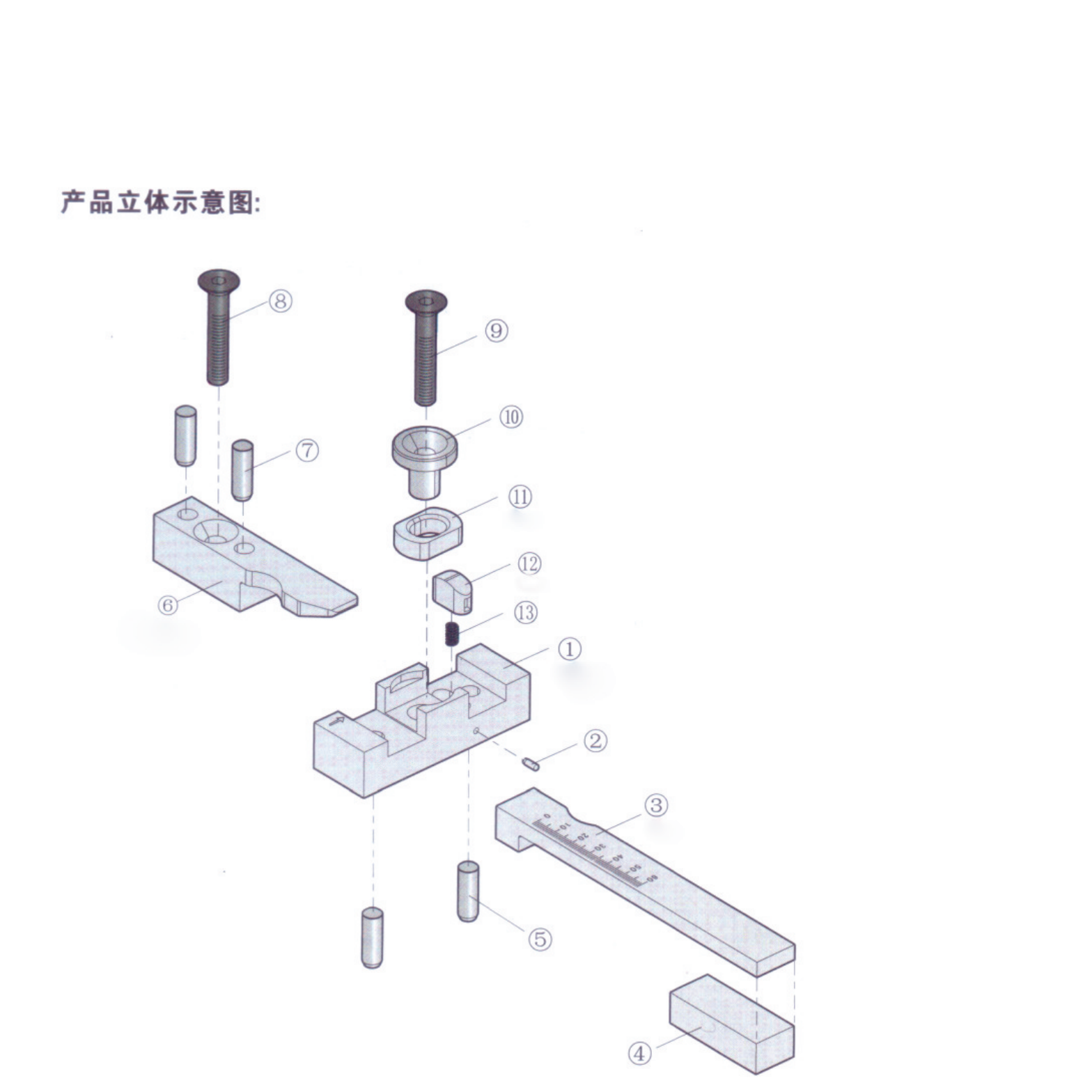 在第一次開模完成后,主體(1)上箭頭將會指向拉桿(3) 0刻度上,此時活動塊 (11)移動,直至完全卡入拉桿(3)的圓弧槽內;