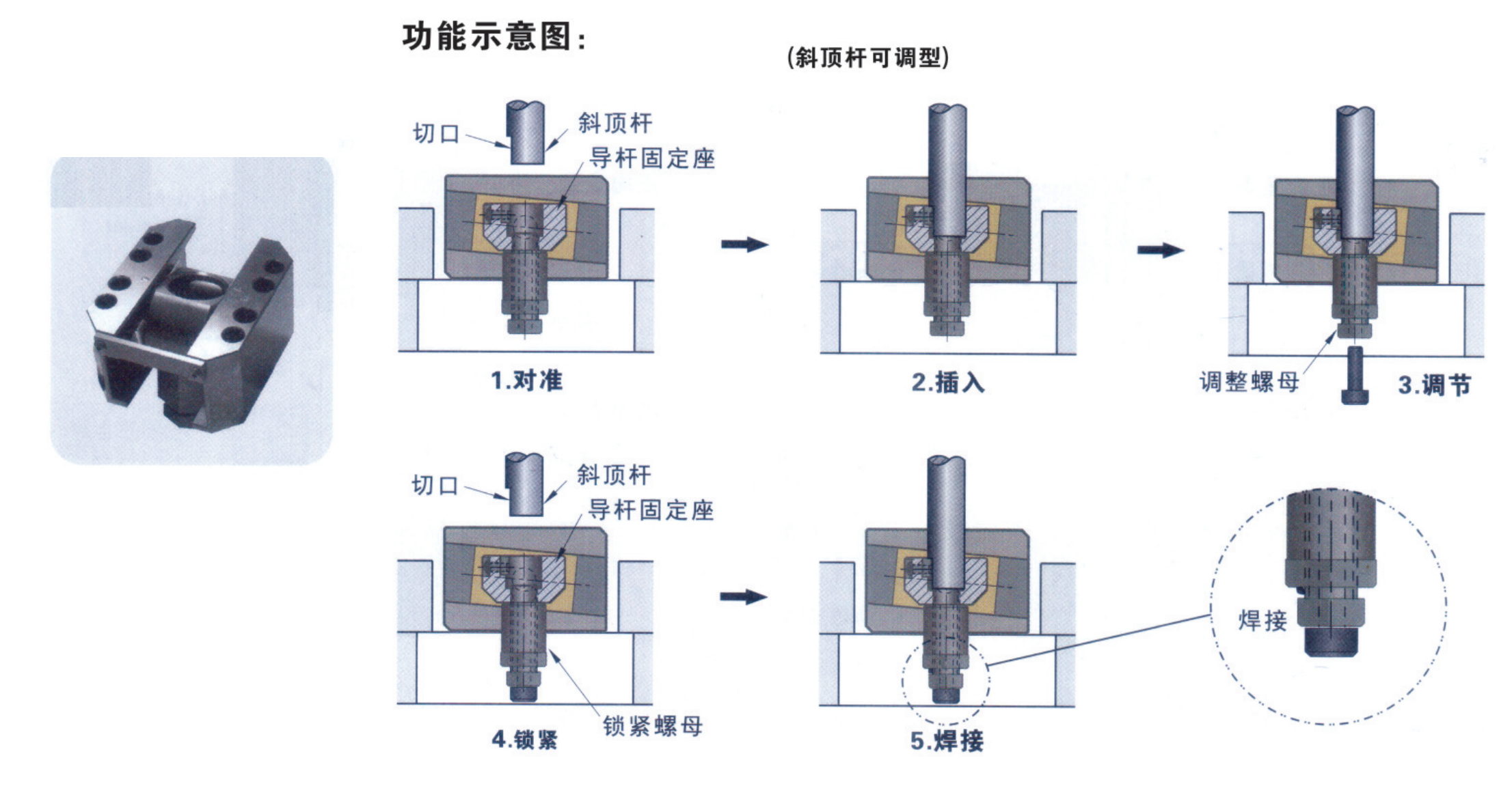 5.為避免斜頂桿松動,將調整螺母與鎖緊螺母焊接防松處理。