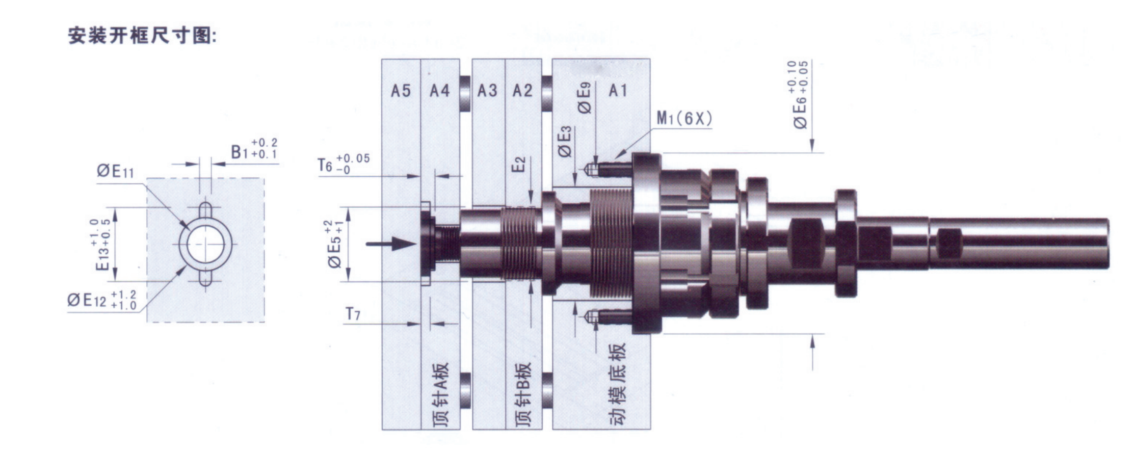 將外牙套旋入定位法蘭,中牙套安裝在頂針B板上,中心頂桿固定在頂針A板上,為方便安裝可以自制小型法蘭因定頂針板上再與中牙套或中心頂桿固定;