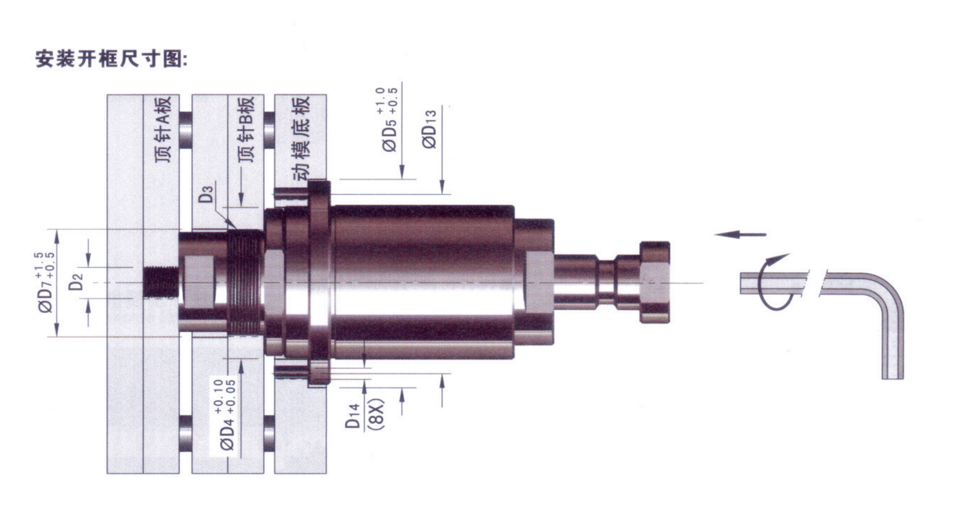 安裝連接桿,使用六角扳手從中心桿尾部插入,通過自帶的杯頭螺絲將連接桿固定 在頂針A板上;