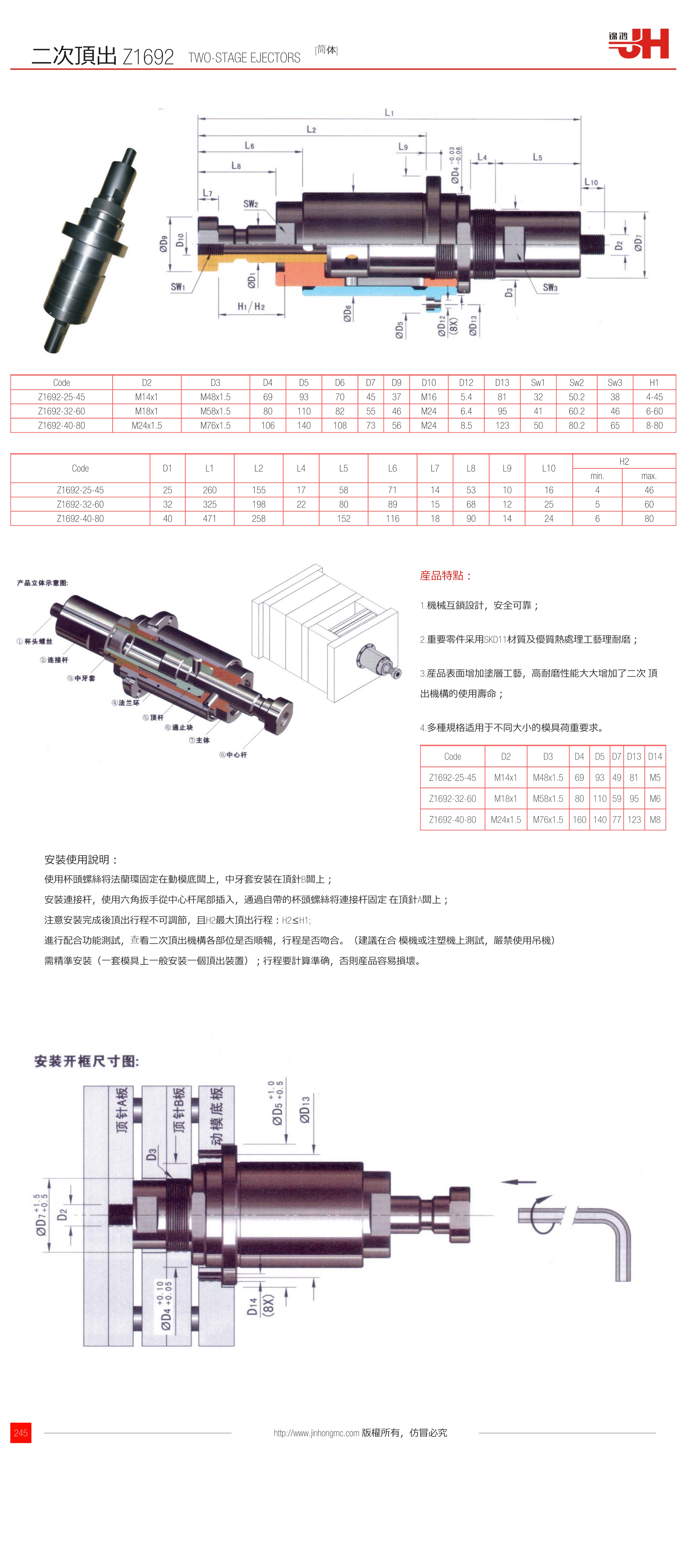 注意安裝完成后頂出行程不可調節,且H2最大頂出行程:H2≤H1;