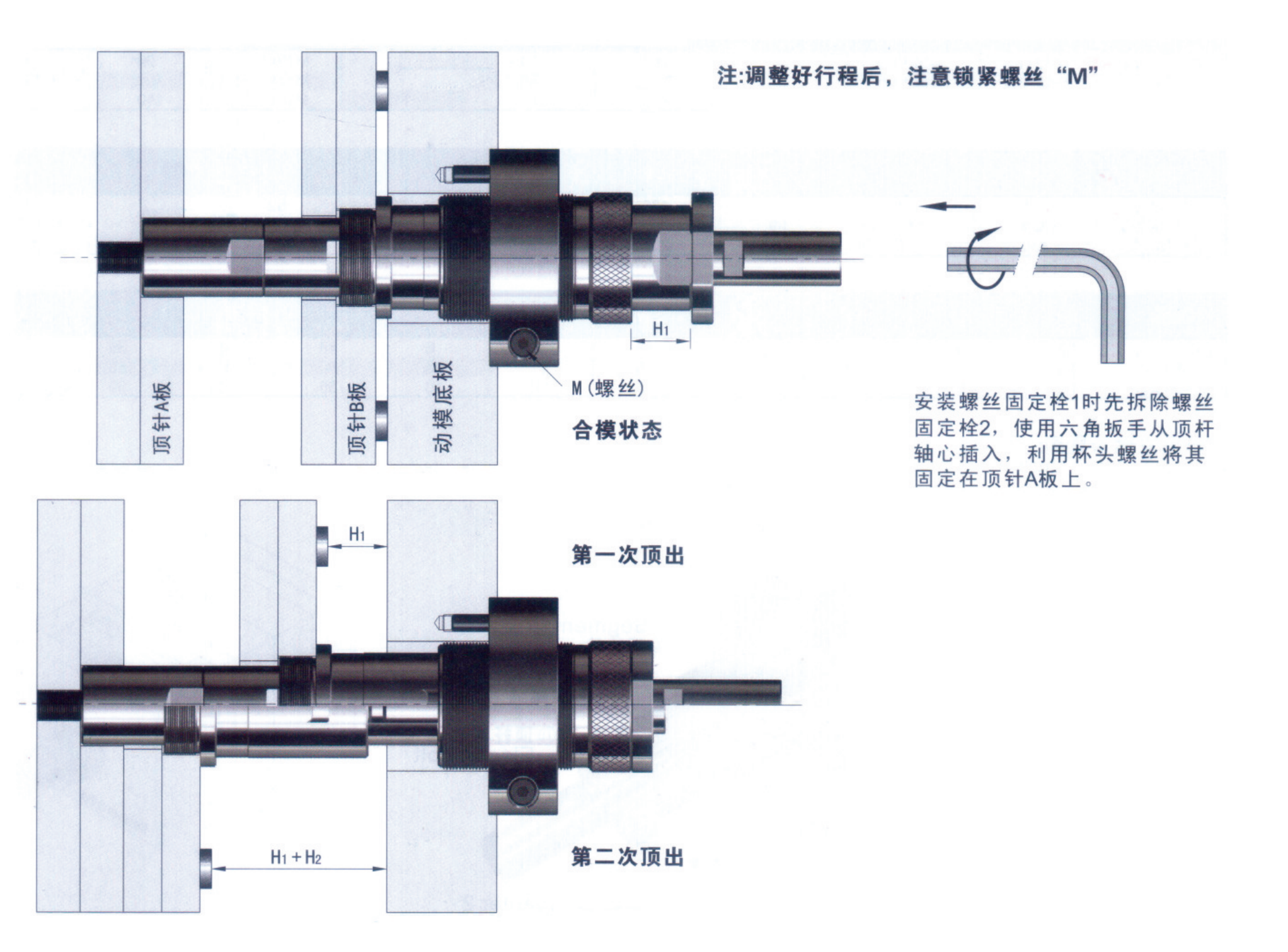 “固定圈”在組裝時已經過加固處理,為保證頂出機構正常使用,在使用前后不可隨意拆卸! 需精準安裝(一套模具上一般安裝一個頂出裝置);行程要計算準確,否則產品容易損壞.