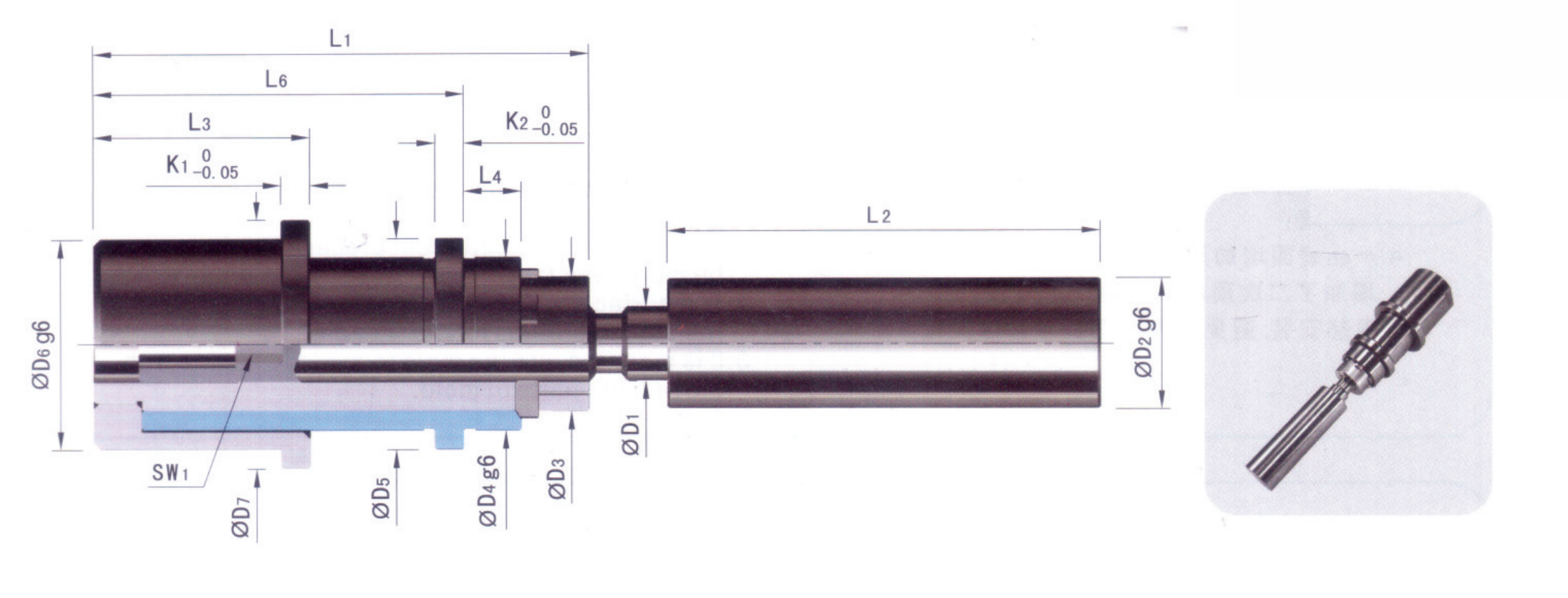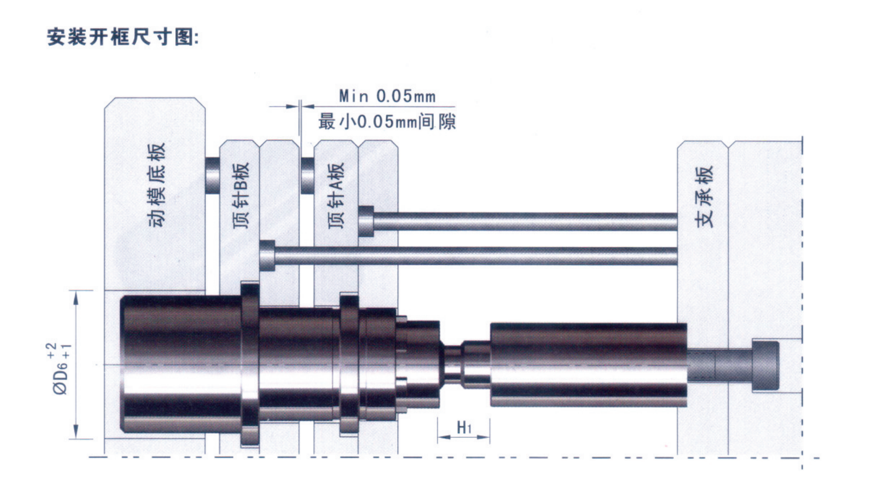 • 安裝中心插桿,需精確計算第一次頂出行程“H1”,可按實際需求從中心插桿大徑一端載斷 后加工安裝螺孔,并使用杯頭螺絲將其固定支承板。注意截斷處端面要求與中心插桿垂直,中 心插桿鎖緊前與確定已對準內襯套軸心,安裝完成后頂出行程不可調整;