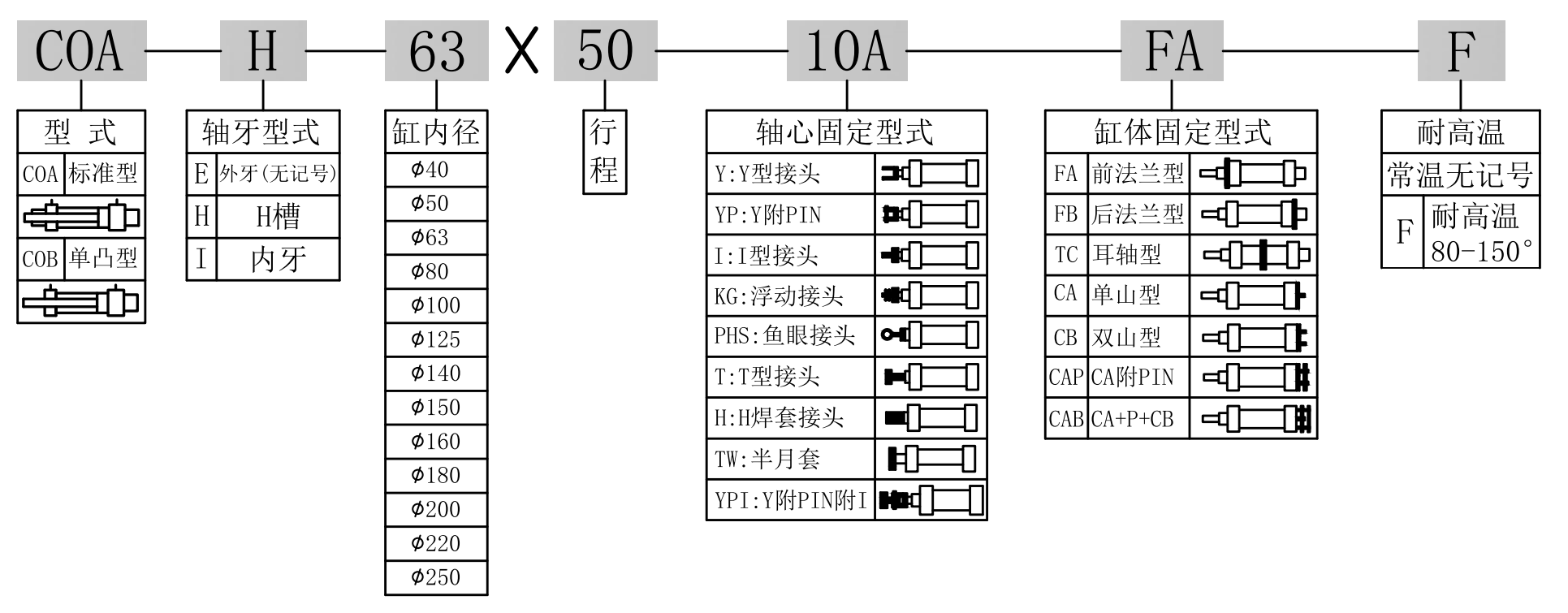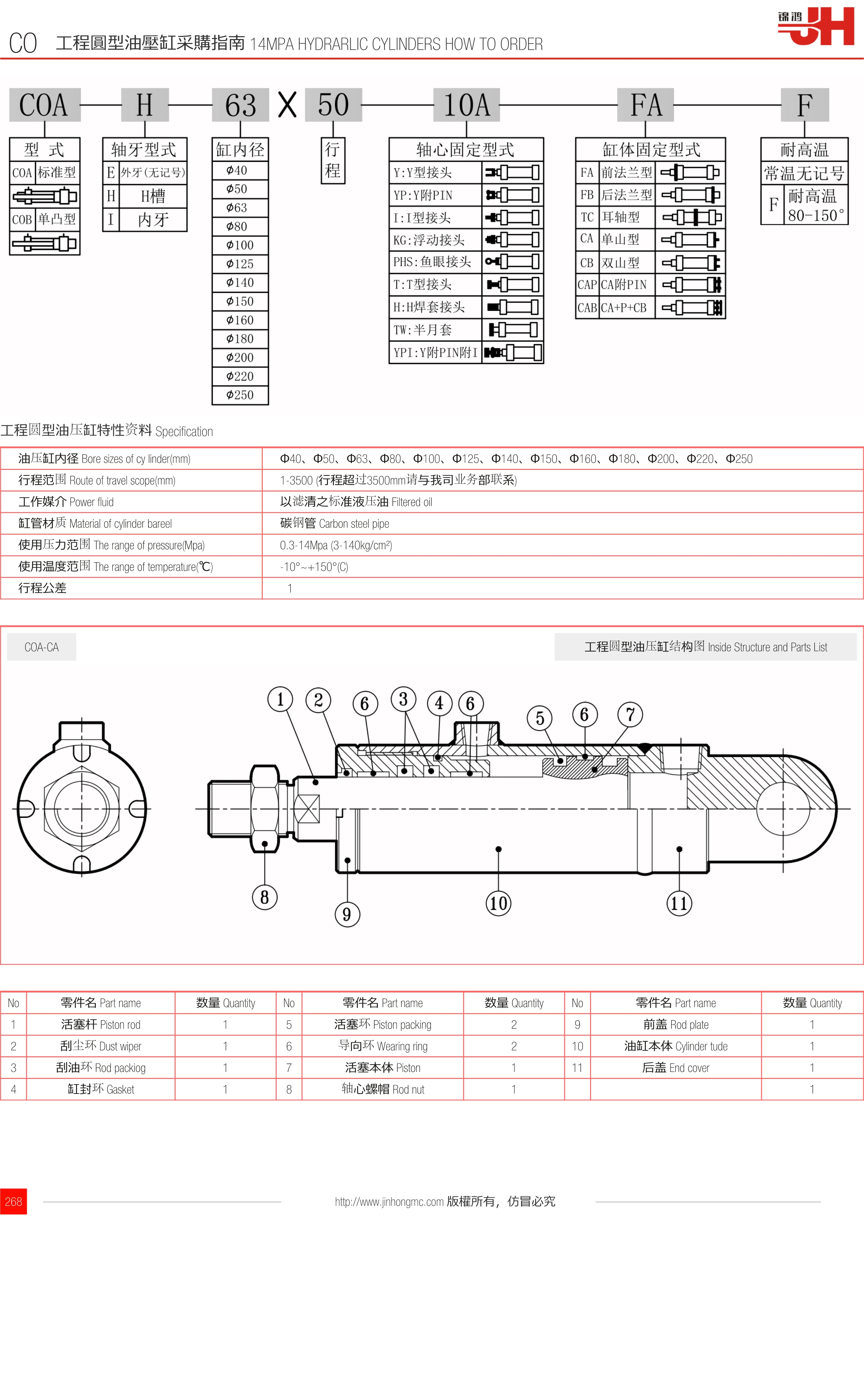 油壓缸內徑 Bore sizes of cy linder(mm)Φ40、Φ50、Φ63、Φ80、Φ100、Φ125、Φ140、Φ150、Φ160、Φ180、Φ200、Φ220、Φ250