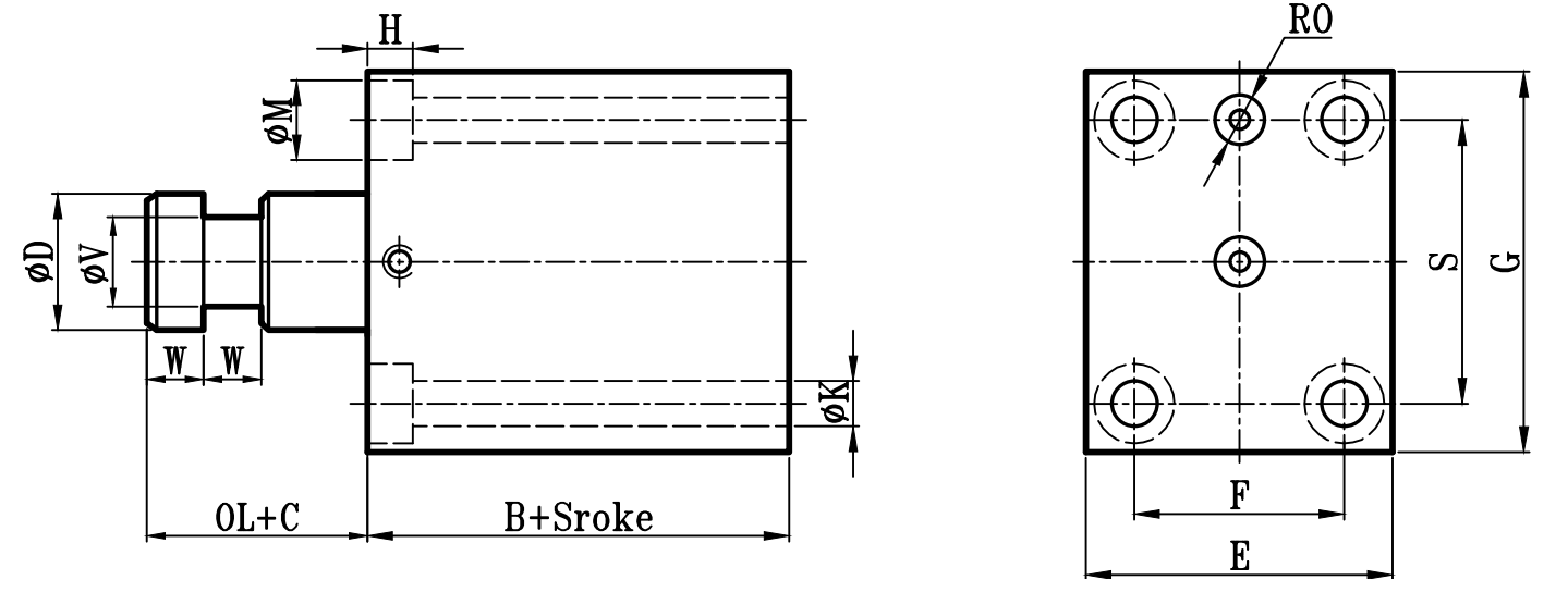 | 缸徑 BORE | A | B | C | ΦD | E | F | S | G | ΦK | ΦM | H | RO | J | JH | O | OL | W | ΦV |