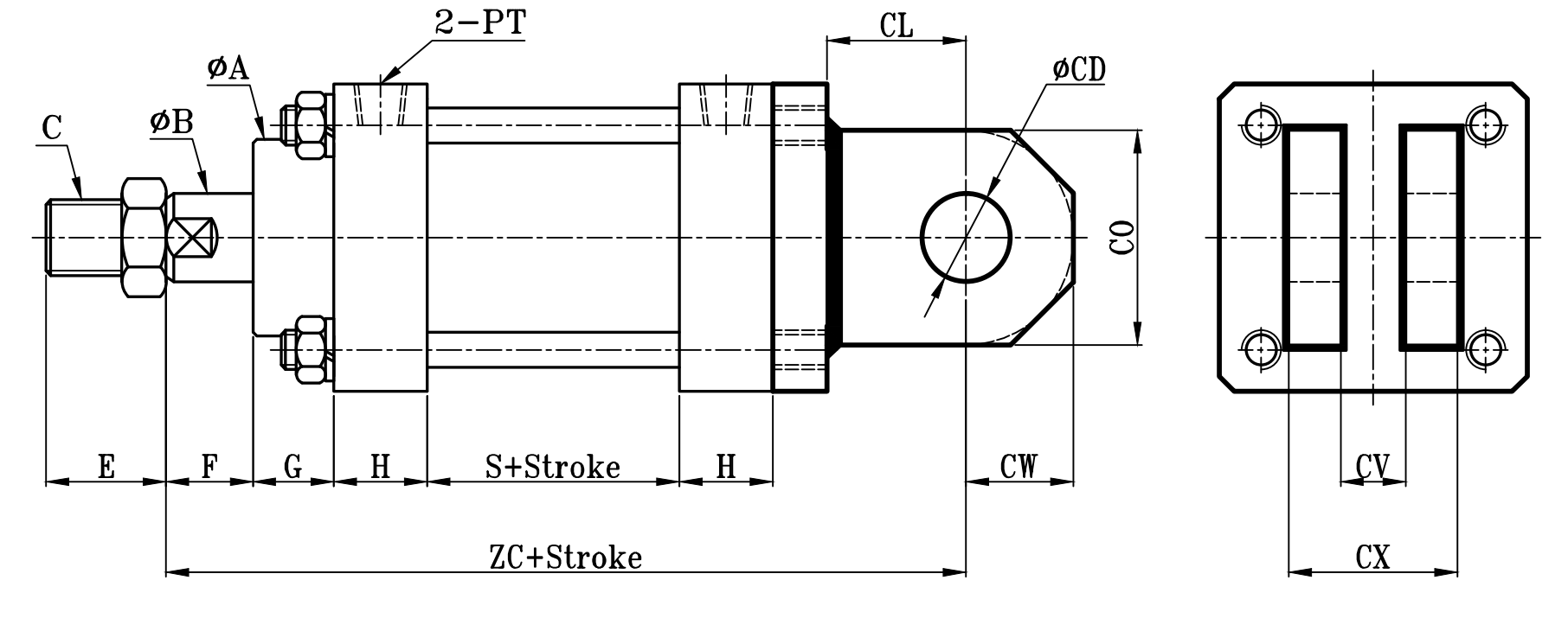 | 缸徑 BORE | ΦA | ΦB | C | E | F | G | H | PT | S | ZC | ΦCD | CL | CV | CW | CO | CX |