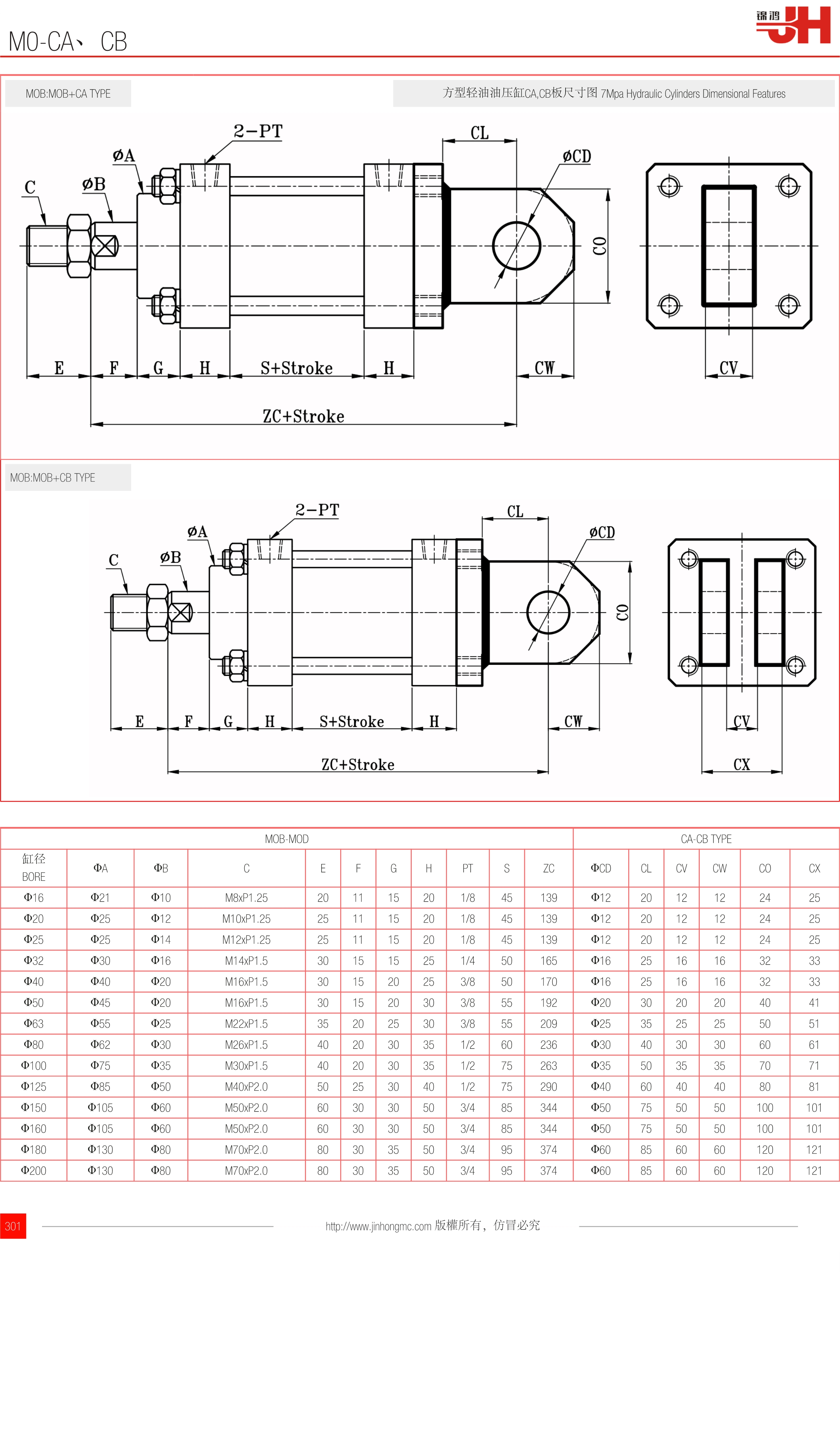 MOB:MOB+CA TYPE | 方型輕油油壓缸CA,CB板尺寸圖 7Mpa Hydraulic Cylinders Dimensional Features |