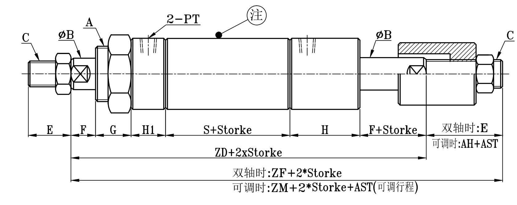 注:感應油缸時,不論是單軸還是雙軸缸,缸筒長度的選擇均為雙軸缸的缸筒長度