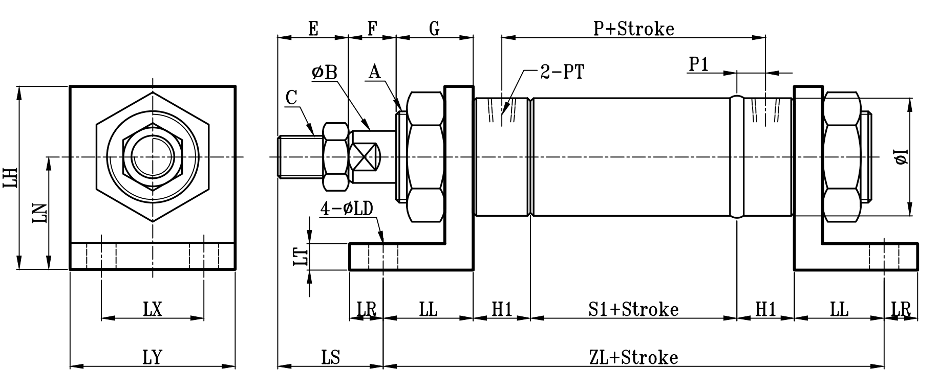 | 缸徑 BORE | A | ΦB | C | E | F | G | H1 | ΦI | P | P1 | PT | S1 | S | LS | ZL | ZLL | ΦLD | LT | LH | LN | LL | LR | LX | LY |