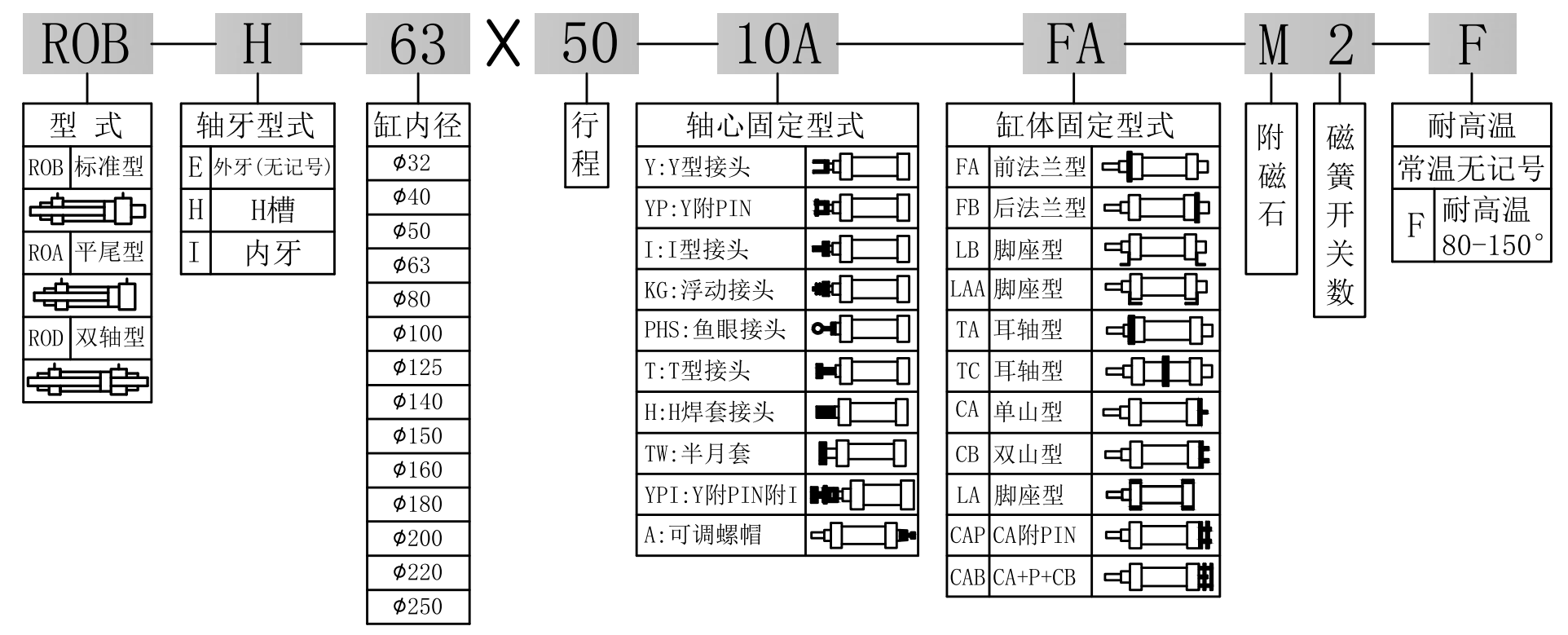 油壓缸內徑 Bore sizes of cy linder(mm)Φ32、Φ40、Φ50、Φ63、Φ80、Φ100、Φ125、Φ140、Φ150、Φ160、Φ180、Φ200、Φ220,Φ250