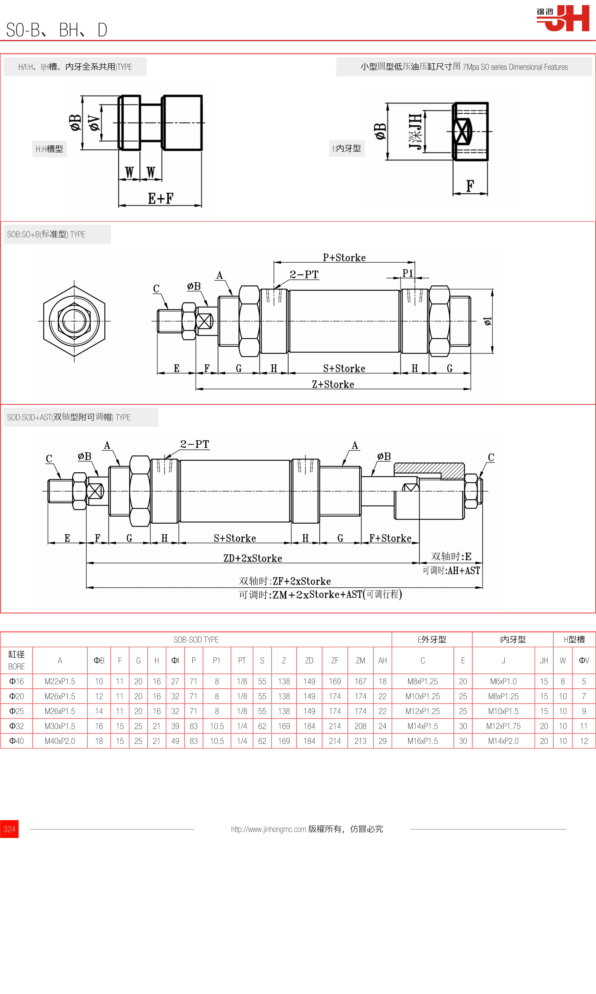 H/I:H、I(H槽、內牙全系共用)TYPE | 小型圓型低壓油壓缸尺寸圖 7Mpa S0 series Dimensional Features |