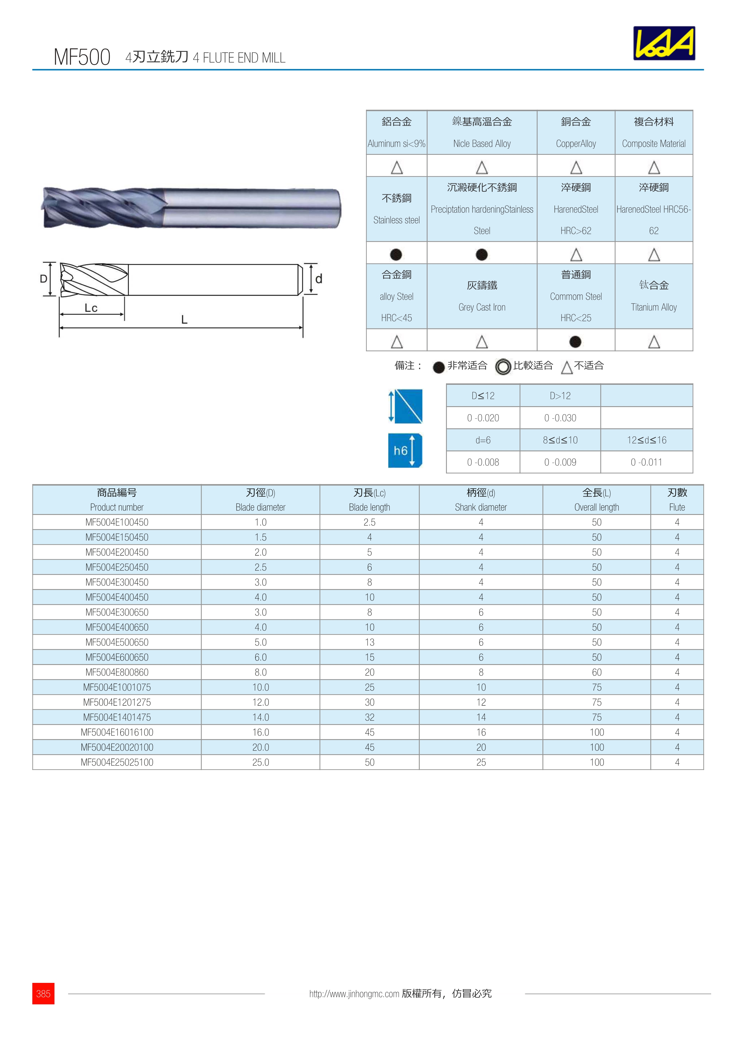 | 商品編號 Product number | 刃徑(D) Blade diameter | 刃長(Lc) Blade length | 柄徑(d) Shank diameter | 全長(L) Overall length | 刃數 Flute |