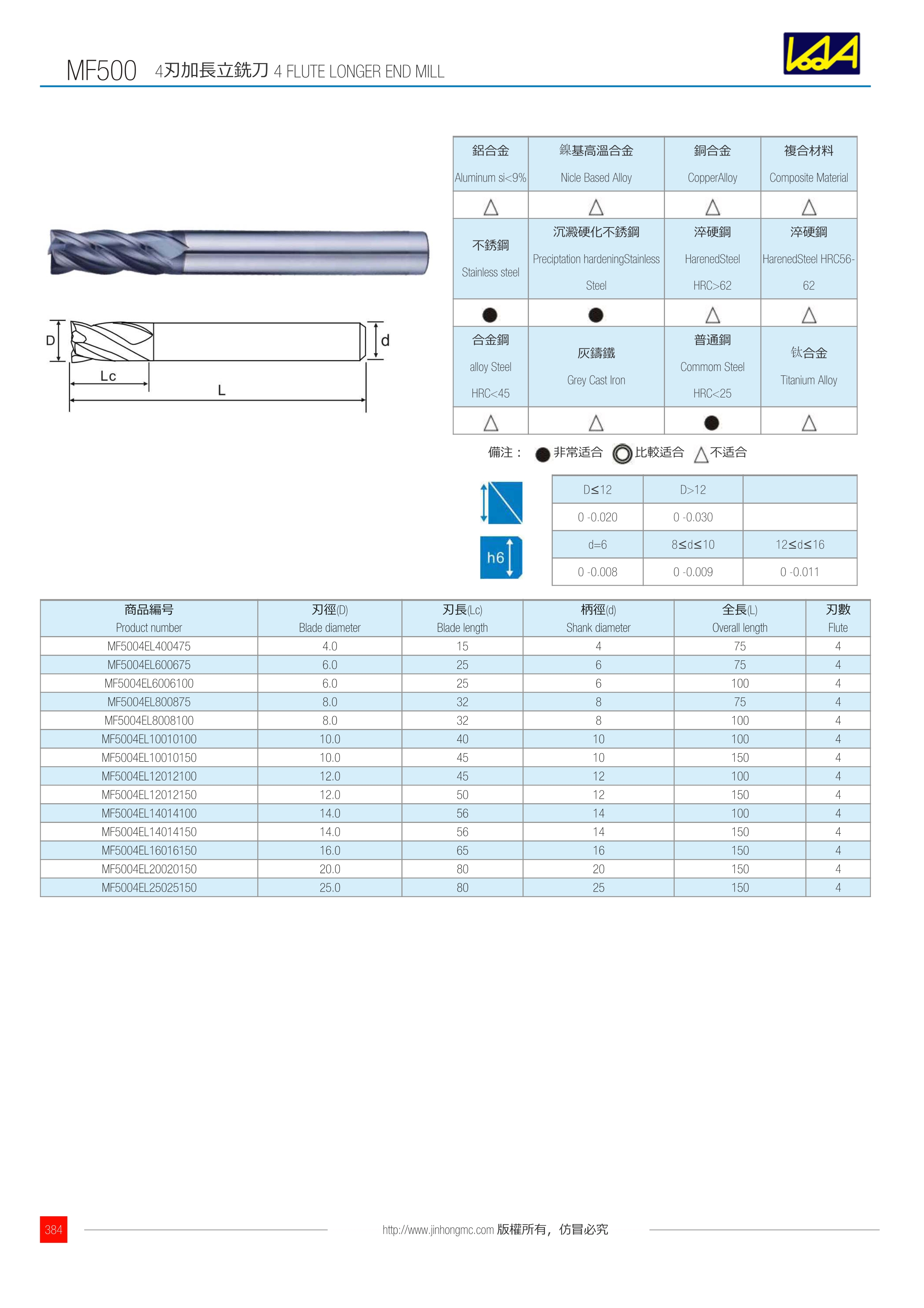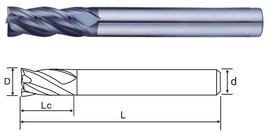 | 商品編號 Product number | 刃徑(D) Blade diameter | 刃長(Lc) Blade length | 柄徑(d) Shank diameter | 全長(L) Overall length | 刃數 Flute |