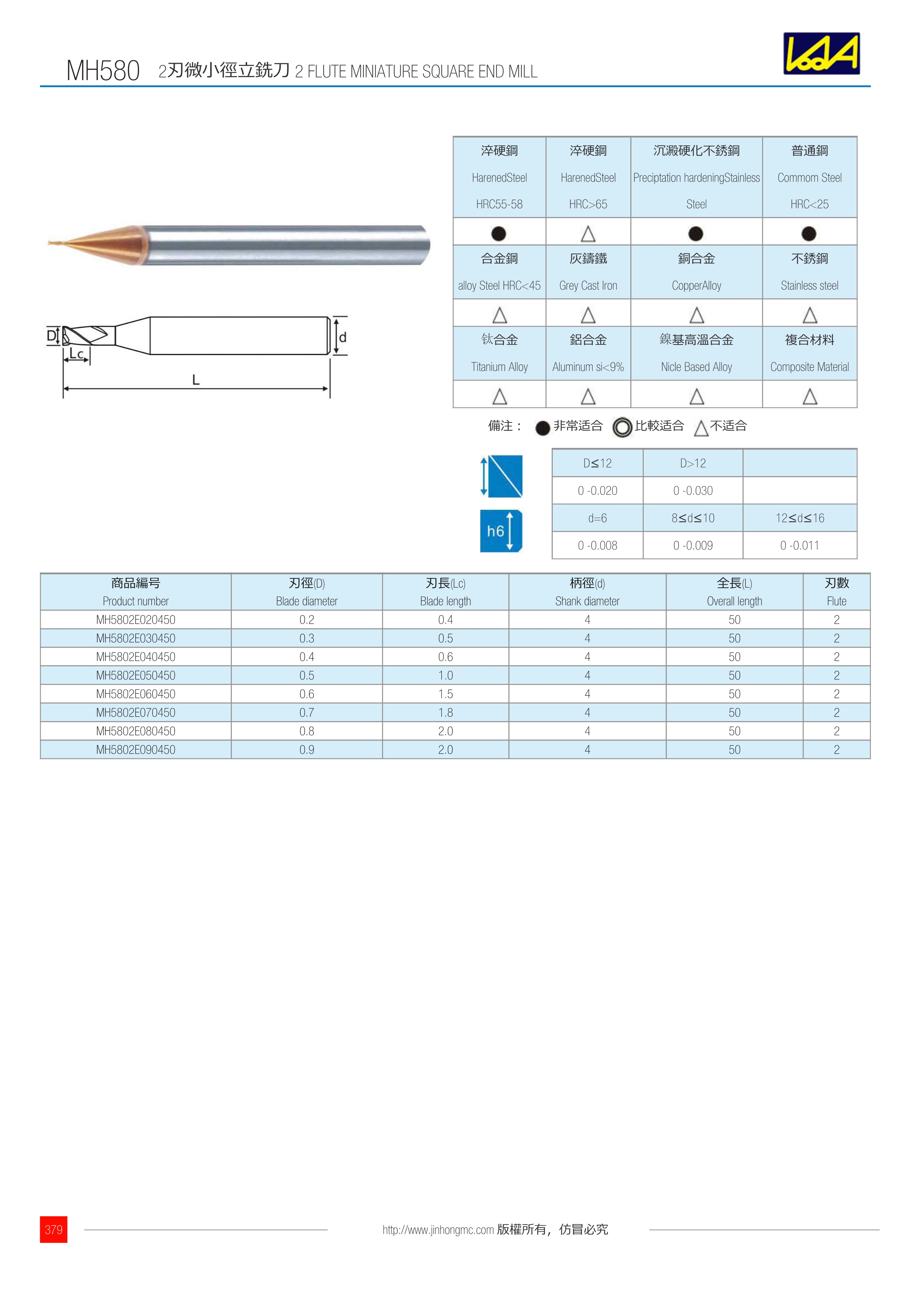 | 商品編號 Product number | 刃徑(D) Blade diameter | 刃長(Lc) Blade length | 柄徑(d) Shank diameter | 全長(L) Overall length | 刃數 Flute |