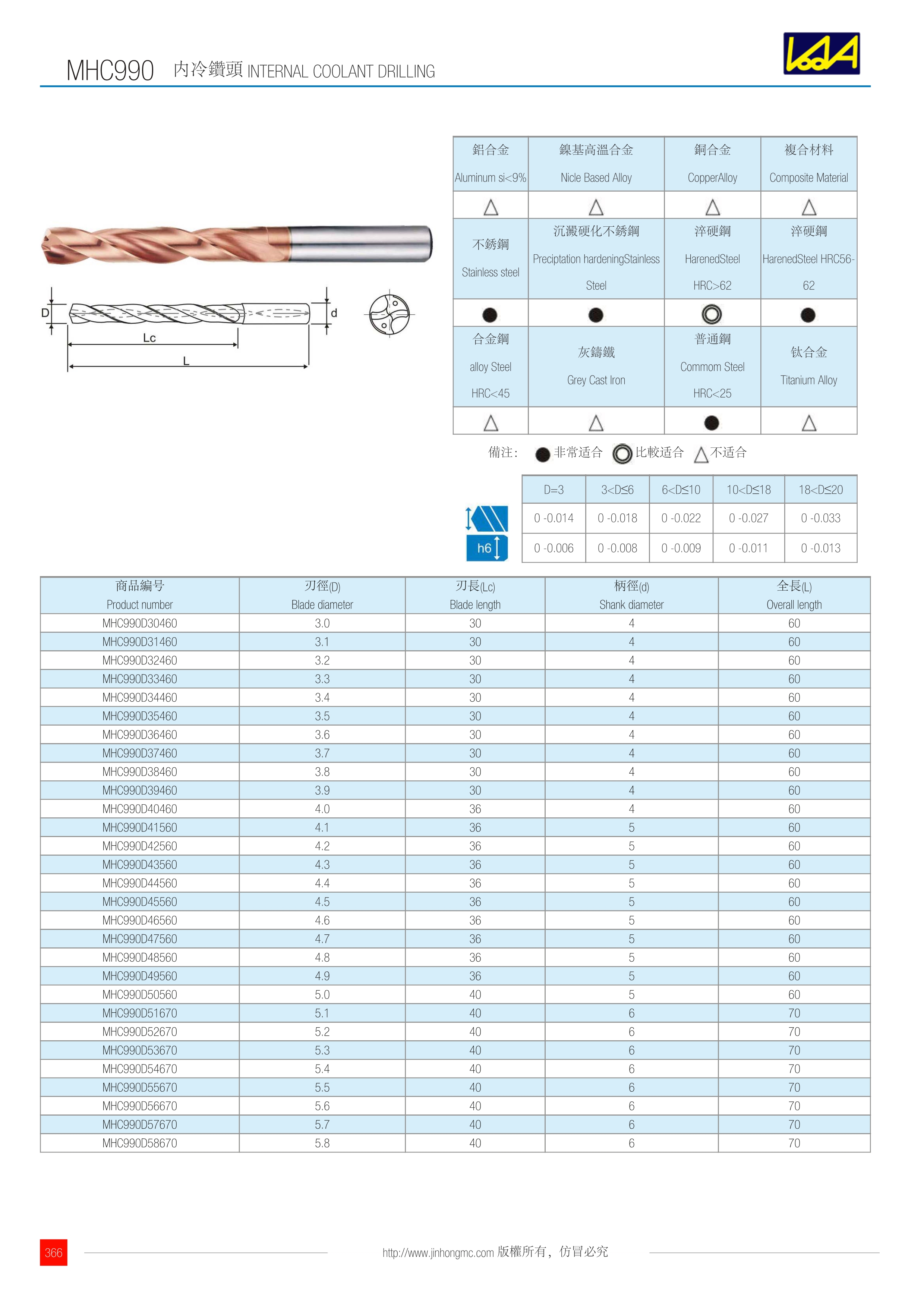 | 商品編號 Product number | 刃徑(D) Blade diameter | 刃長(Lc) Blade length | 柄徑(d) Shank diameter | 全長(L) Overall length |